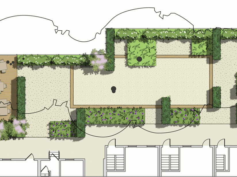A long rectangular paving court unifies the space and creates a tranquil zone, similar to a reflecting pool. Linear hedges perpendicular to the space provide a secondary level of organization that defines the garden views of the ground floor retail. The deck for the restaurant sits at the far end of the garden offering diners a full-length view of the garden. Stone dust paving, reminiscent of a French park, is permeable, allowing water to drain into dry wells that hold it and allow it to filter back into the aquifer.