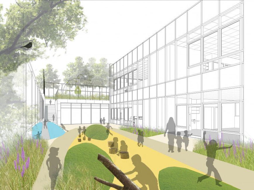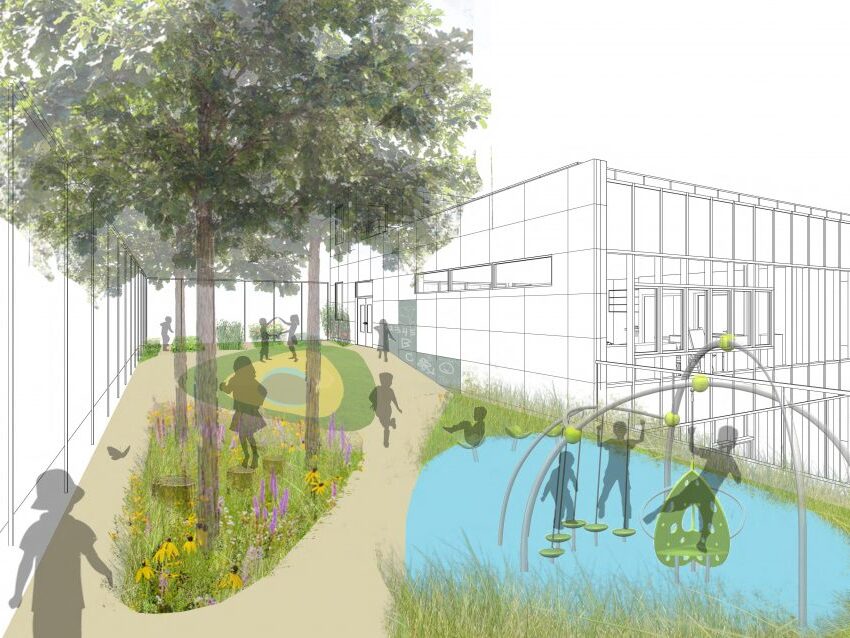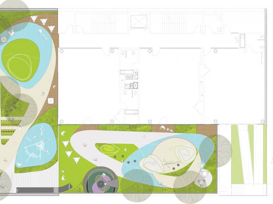 Coney Island Head Start School is a new 35,000 sf building serving low-income pre-school children. The construction was funded by FEMA to replace the previous building that was damaged in Super Storm Sandy. The new design meets all the Head Start Design Directives and integrates green space at each level of the building. The landscape meets the street with an entry ramp through a native dune landscape. The second and third floor rooftop play spaces span the footprint of the classrooms below, and are directly adjacent and accessible to the classrooms they serve. Together, they make up a 5,000 sf multi-level play area incorporating safety surface mounds, vegetable garden plots, natural logs for climbing, and a 12-foot long slide connecting the two levels. JPLA worked in partnership with the Green Belt Native Plant Center to select a palette of plantings indigenous to the area. Our landscape celebrates the coastal dunes in the area, and in doing so, provides an opportunity to teach kids about nature, local ecology and the important role of a resilient landscape.