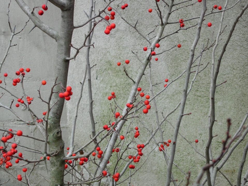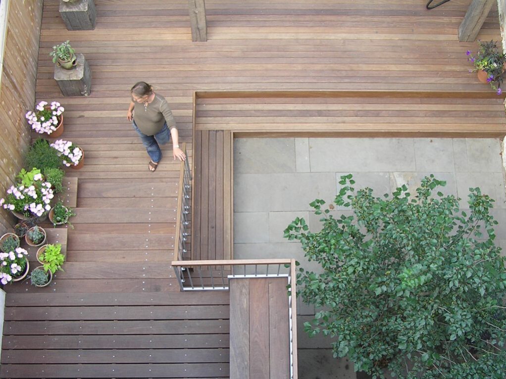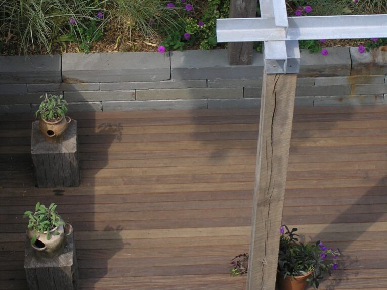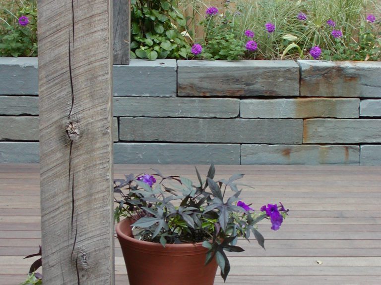 This 625 sf rear garden in Boerum Hill, Brooklyn is designed as a series of outside rooms furnished in exquisite natural materials. At the parlor level, an ipe wood deck creates a fluid entertainment space next to the house. Broad steps leading down from the deck allow comfortable access to a deck on the garden level, which then steps down to a bluestone terrace. Set into the deck is a steel pergola supported by 9-inch square reclaimed wood posts. Larger truncated posts are built into the deck as seats or planter pedestals. At the back of the garden, a retaining wall made of reused stair treads in iron streaked solid bluestone is planted with a thicket of wild grasses and flowers. A red berried hawthorn tree is also planted next to the large windows at the back of the house both to create display and to give privacy to the residence.