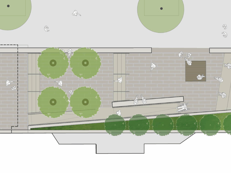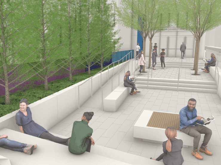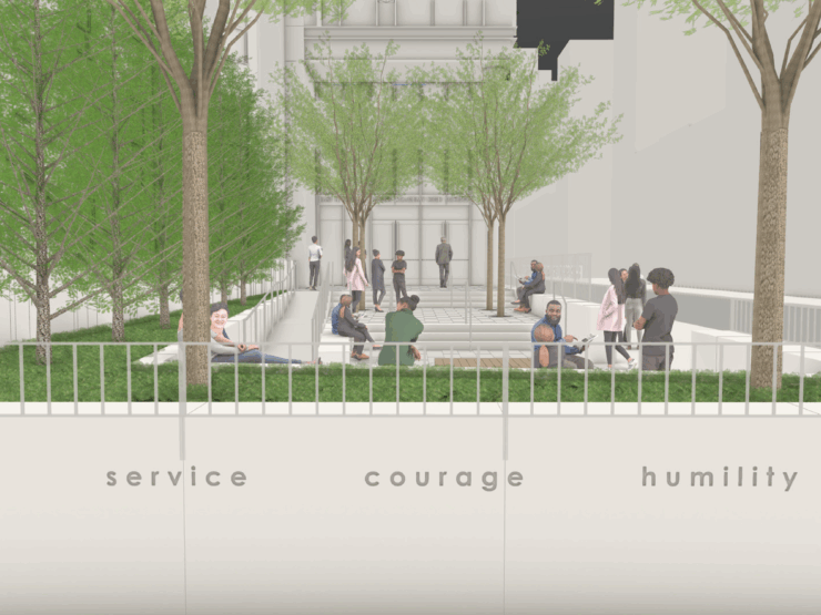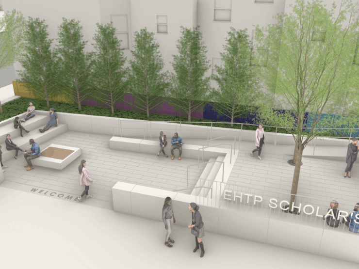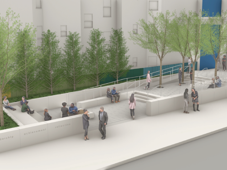 The ground floor entry plaza and roof terrace for the new building of the East Harlem Tutorial Program’s Scholar’s Academy High School offer amenity spaces that enrich the student experience and enhance the surrounding neighborhood. Anchoring the corner of 1st Avenue and 104th Street, the school’s entrance plaza is a welcoming space for students, educators, and the surrounding community. Cast stone site walls extending from the building’s base frame the plaza and form a gateway that guides the daily flow of people through an open paved landscape and up monumental steps to the school’s entrance. Amphitheater sit steps and a custom wood deck platform are flexible sites for gathering and events. A pair of canopy trees and a row of columnar trees create a lush backdrop to the plaza, and a visual buffer for neighbors.