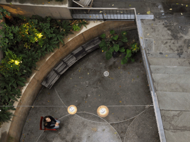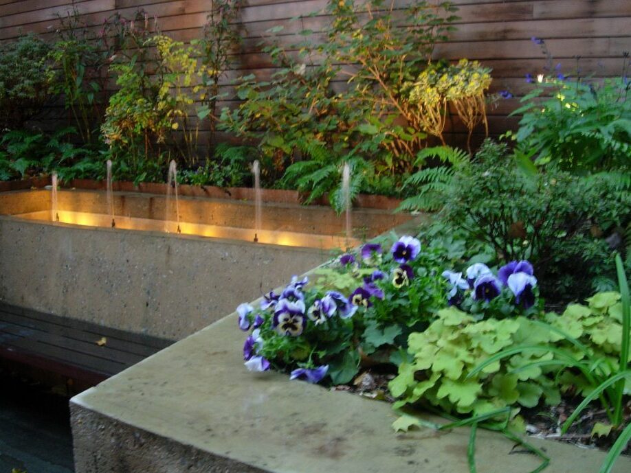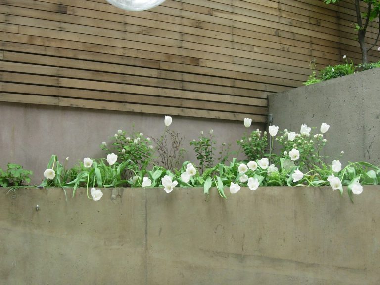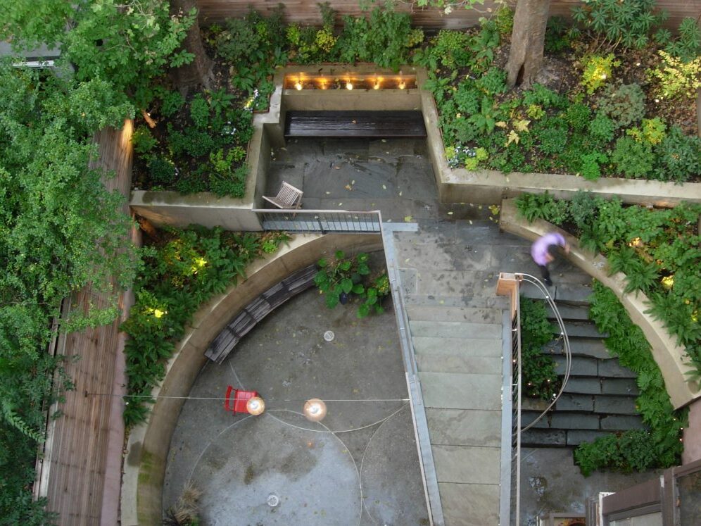 The design of this 1,200 sf private garden near Gramercy Park is structured around a curved pre-cast concrete retaining wall. The wall serves regulatory, aesthetic and structural purposes. It was placed to satisfy the required level-yard setback from the ground floor living space. It creates a beautiful enclosure to the space and its form is echoed in stainless steel rings set into the paving. The arc wall supports the upper level of the garden and in doing so, protects two 100-year old sycamores trees that pre-exist the garden.