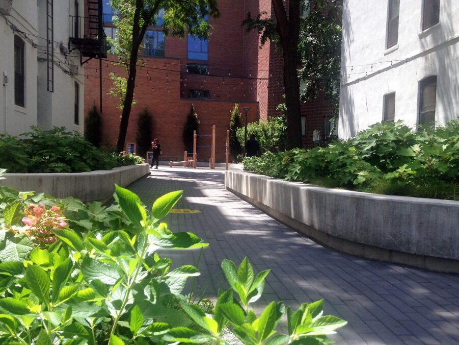 The landscape for Millbank Frawley serves the residents of its 80 apartment units. The primary design goals were to open up the space and enrich the quality of the exterior landscape. JPLA achieved this by removing fences and walls that limited circulation, giving way to a central pathway with lush plantings, continuous seat walls and access to quiet and active spaces. The new landscape includes programmed spaces such as a playground, adult fitness area, and community gardens, and flexible spaces such as a seating area under decorative lighting. A verdant and sustainable landscape was created using a materials palette of native and adaptive plantings and permeable paving. The landscape is a beautiful, safe, open court that offers enrichment for residents of all ages.