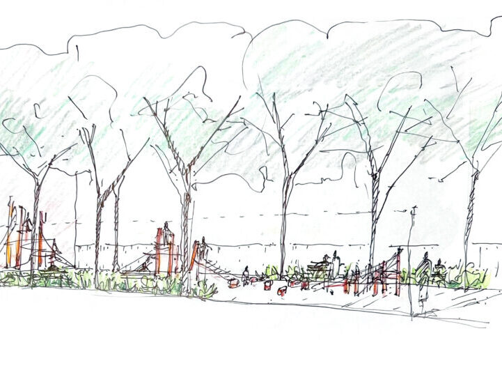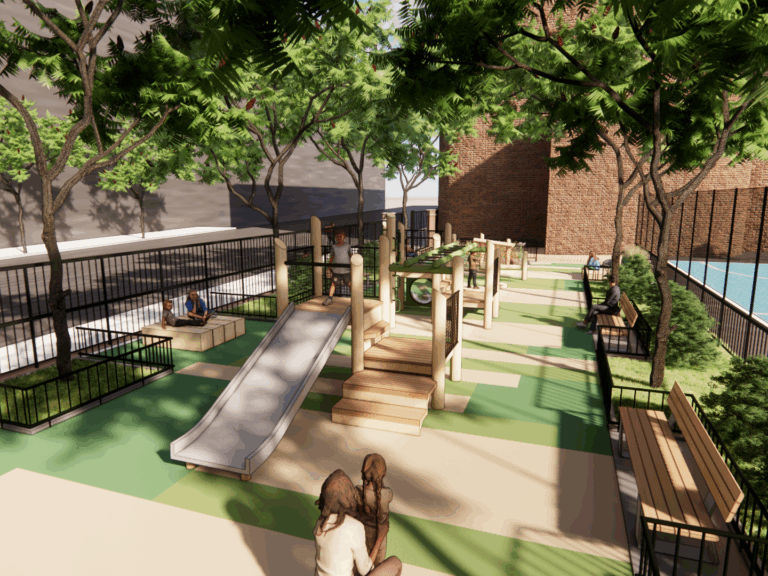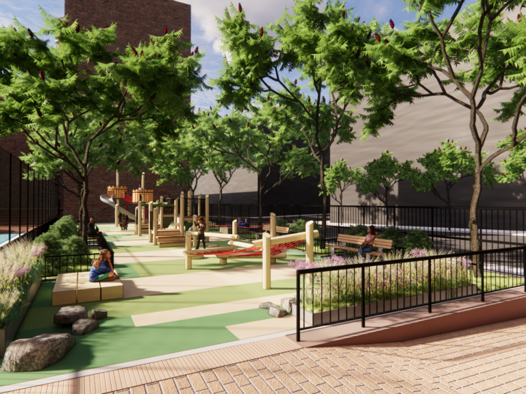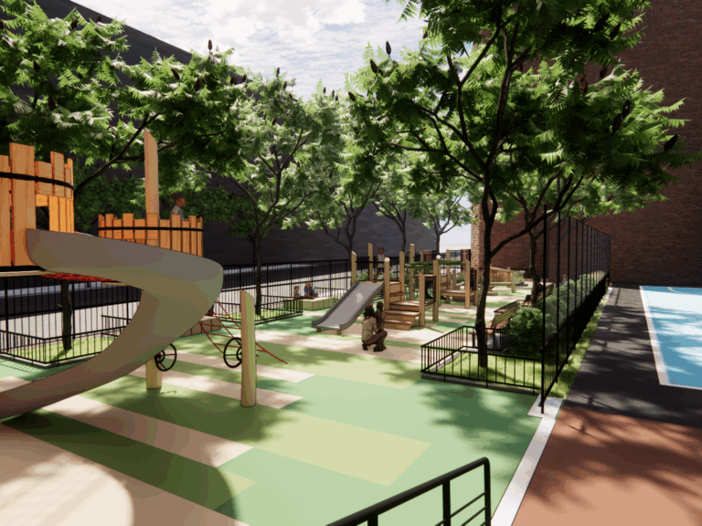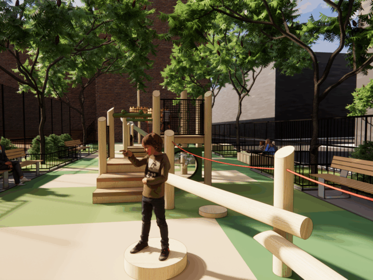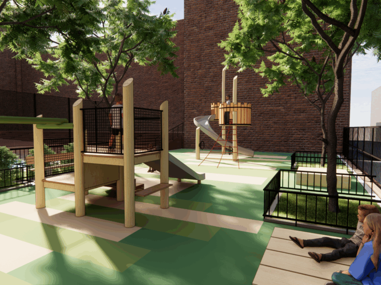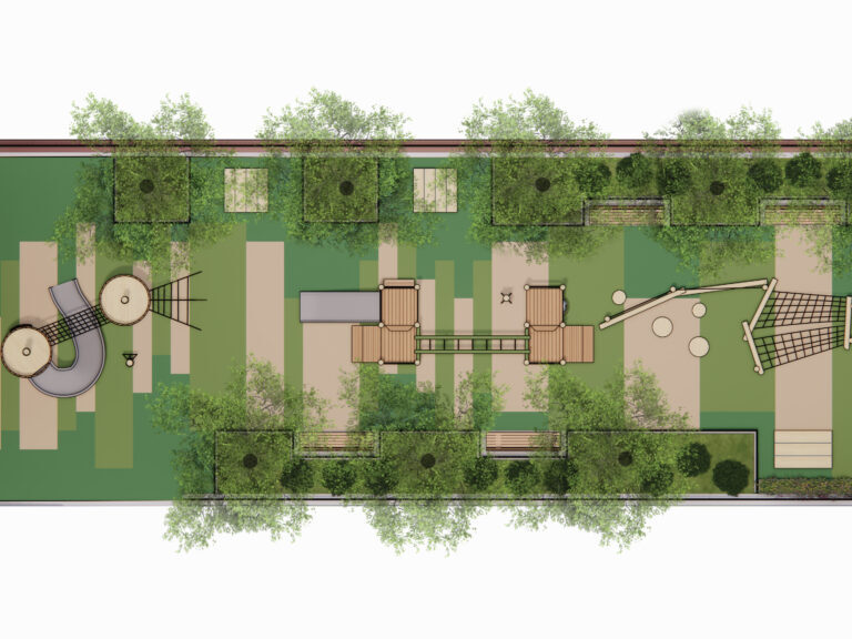 The goal of the playground renovation at this NYC Public Elementary School was to replace the existing playground’s outdated and uninspired equipment and deteriorating safety surfacing with a dynamic and durable playground design that can be enjoyed for many years to come. Expanding the existing tree pits into continuous planting areas serves to protect and revitalize the health of the mature Honey Locusts and to frame the playground with a lush border of shrubs and groundcovers. The design of custom wood play structures atop a rhythmic patterning of safety tiles in a natural palette offers a balance of active and imaginative play and rest. A signature castle tower play structure draws inspiration from the neighboring historic Armory with two turrets connected by a climbing bridge and a spiral slide. Beyond school hours, this enriching play space will be open to the children and caregivers of the larger community.