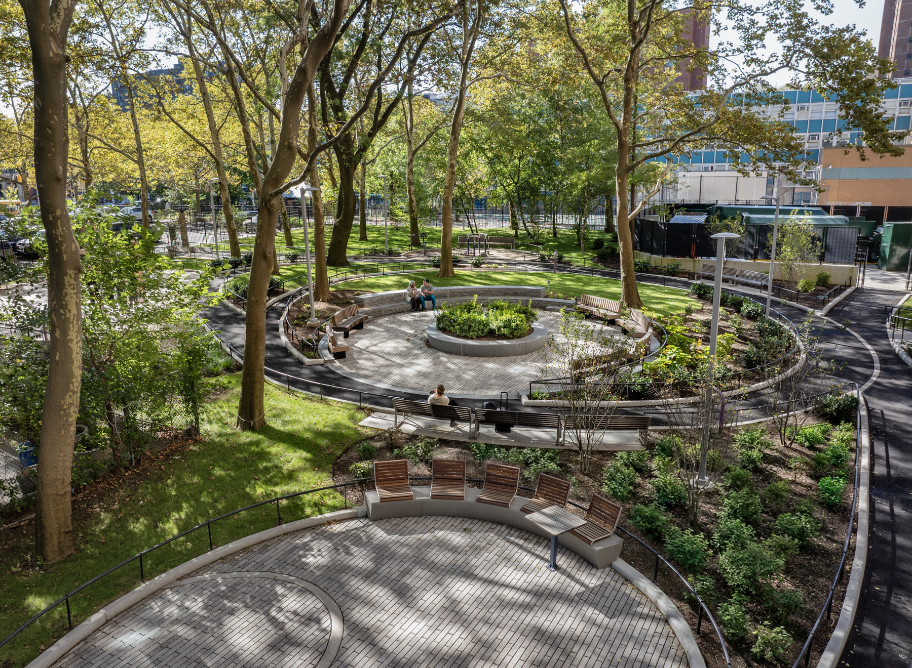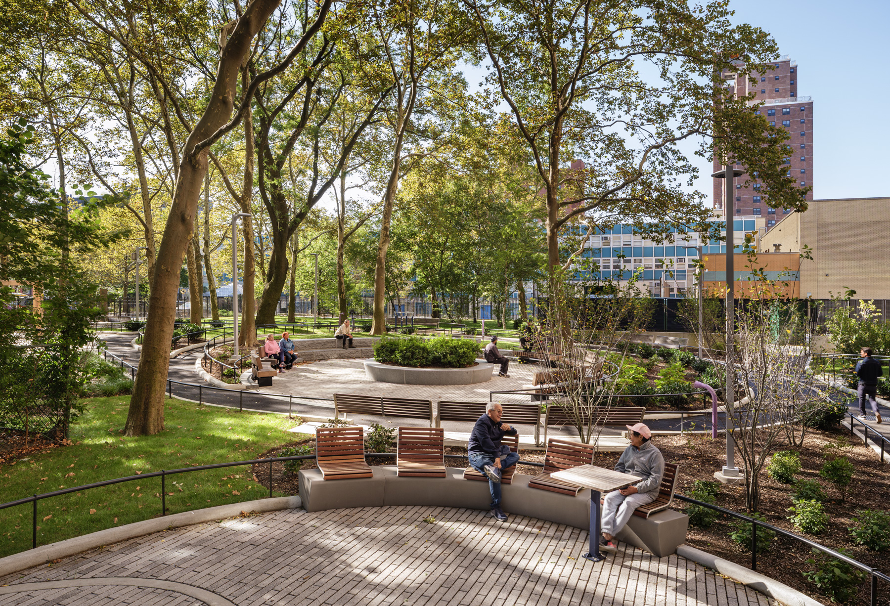 Tenants at Bethune were clear about what they needed: a space where grandparents could bring grandchildren, where elderly residents could walk and exercise safely, where people could gather for lunch or celebrate together, and where the grounds felt tended and respected. The design addresses each request with a calm, park-like landscape that preserves the site’s existing mature canopy trees and organizes the space around a network of curvilinear paths that encourage walking and exploration.