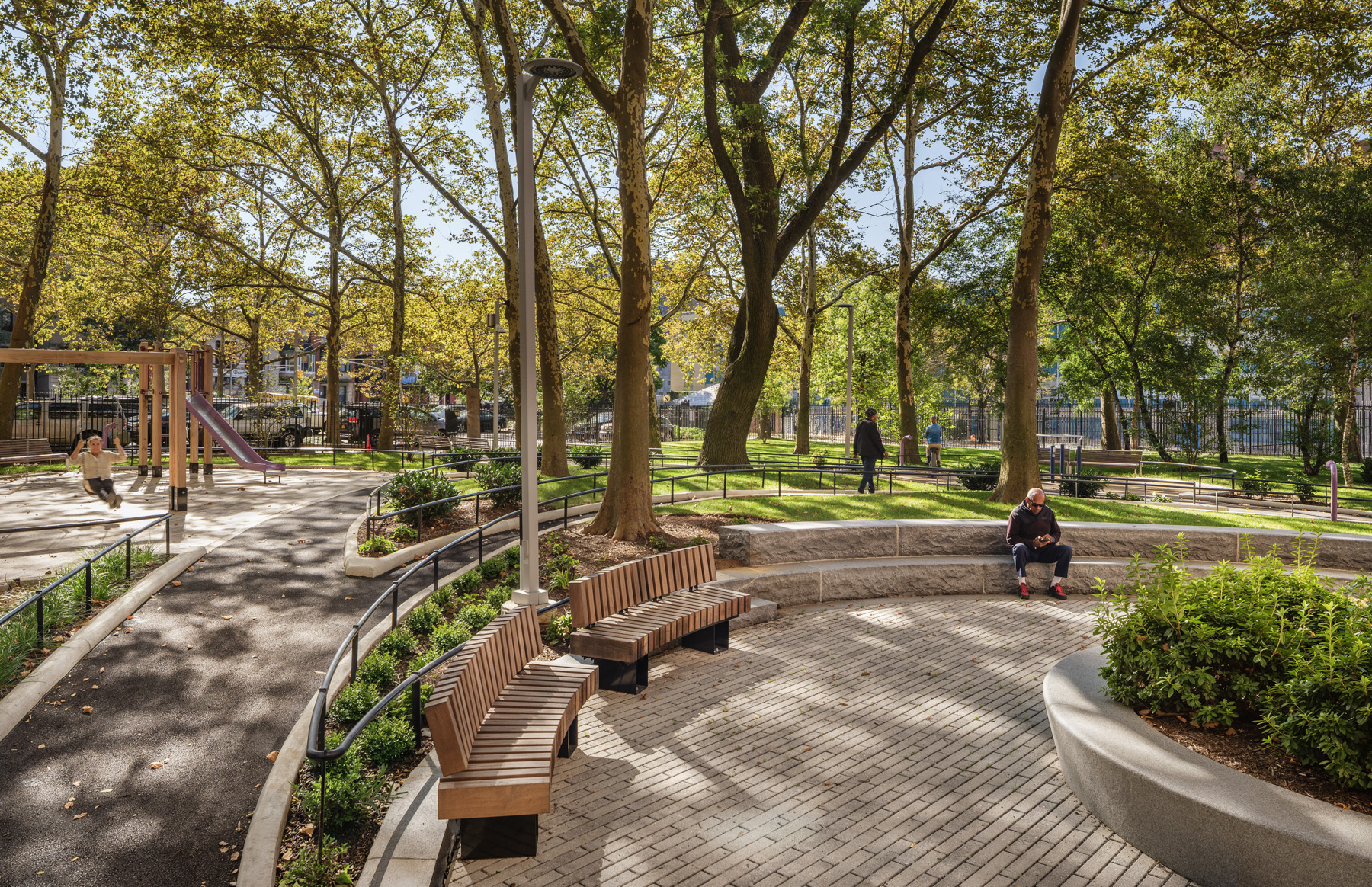 Born in 1875, she founded schools and hospitals, advised President Roosevelt on racial inequality, and helped draft the United Nations Charter. Her words —“Our children must never lose their zeal for building a better world”— are carved into flush curbing at the site and guide everything about how this landscape was created.