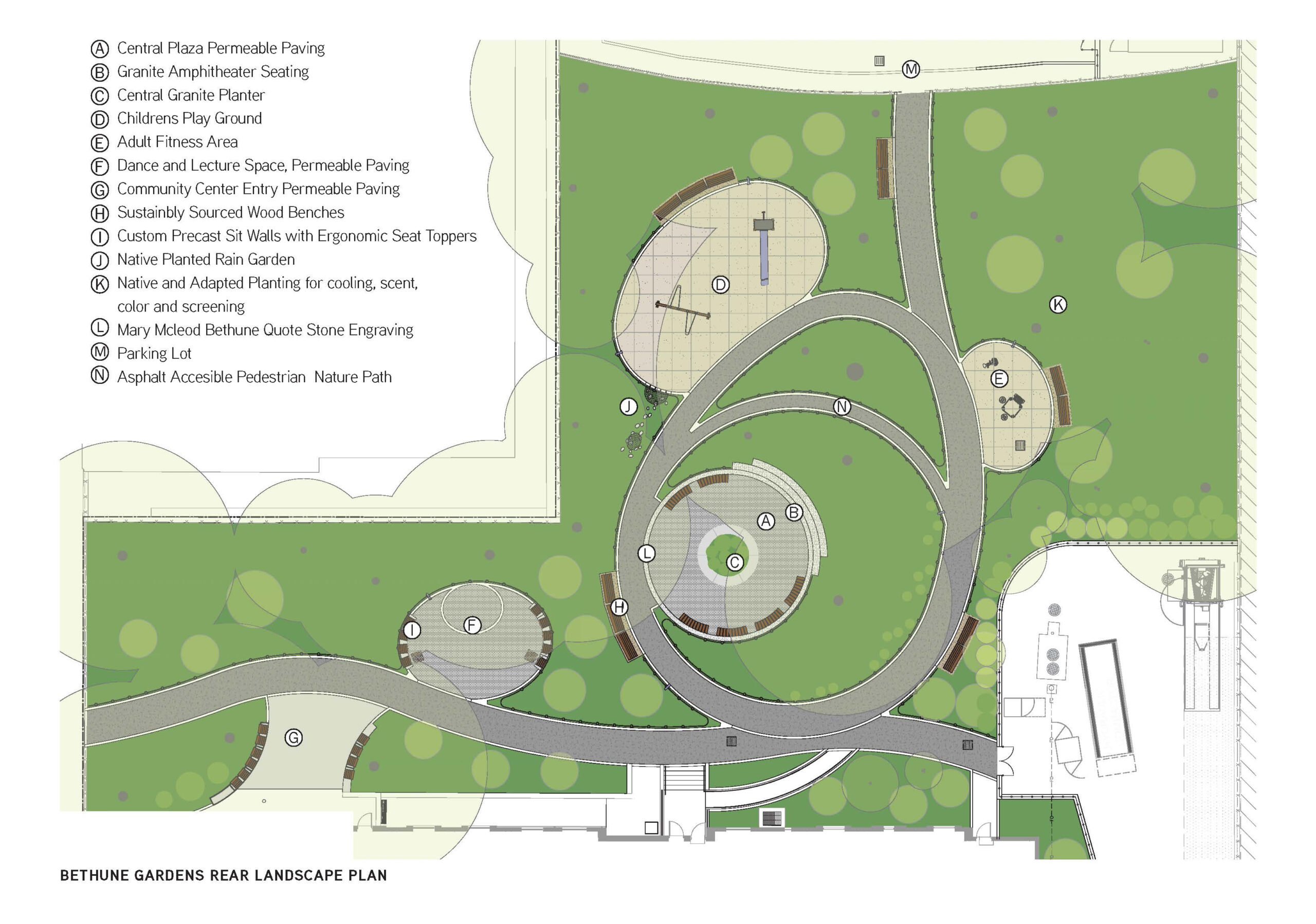 Bethune Gardens is a landscape designed in the spirit of its namesake: Mary McLeod Bethune, who spent her life building institutions, nurturing communities, and insisting that Black women and girls had the right to education, dignity, and opportunity. Bethune Gardens’ design reflects the belief that these communities deserve outdoor spaces that are genuinely respected, intentionally designed, and built to last. The curvilinear paths and amphitheater spaces, benches are the design’s central gesture, creating a soothing nature walk that resembles and represents the community being held in the arms of Mary McLeod Bethune, receiving the respect for the space and its residents that they asked for and deserved.