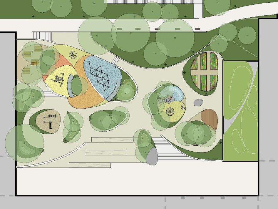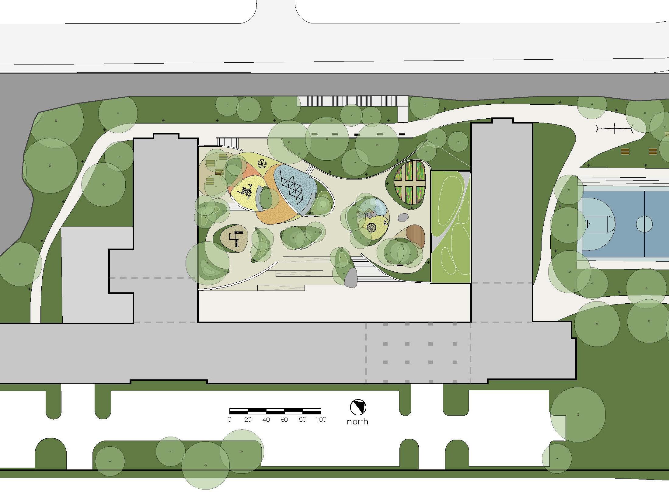 The design opens up the site, removing existing barriers to entry and makes use of the dramatic elevation changes across the site to structure a landscape that is open and accessible with an interplay between spaces. A design language of rounded organic forms softens the space within the building’s envelope and invites a fluid circulation throughout the space and access to a variety of flexible and programmed spaces. Amenities include children’s playgrounds, water play, vegetable gardens, adult fitness areas, as well as picnic tables, benches and community gathering spaces.