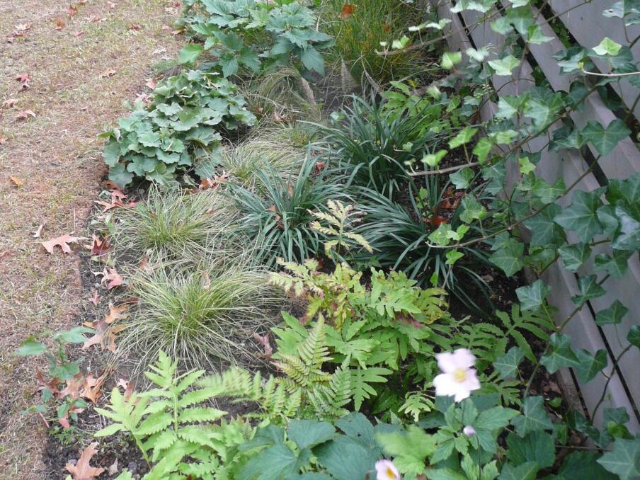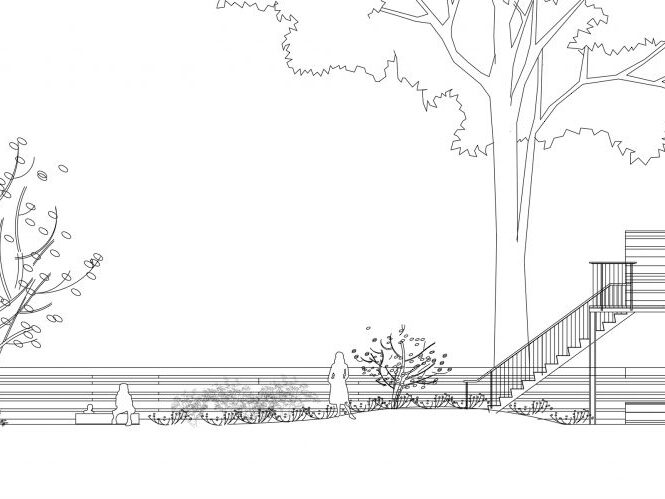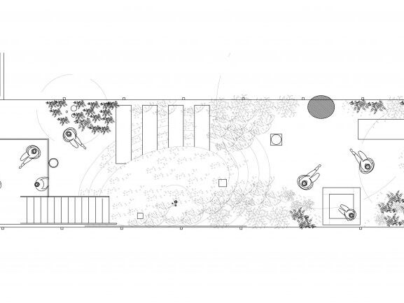 This rear townhouse garden was designed for a textile artist using a soothing palette of soft grey tones. A concrete deck off the parlor level leads down to the garden with wide, shallow steel steps that allow for a journey into this long, narrow space. A two-foot tall clover mound rises to meet the deck steps, reducing the grade change from the deck above and adding topography and curvature to the garden. The mound is intersected on one side by raised raw-steel planters for vegetable gardening. Another side of the mound is terraced with raw steel walls that retain a flat space paved with stone dust. Under the deck, a concrete dining terrace is set apart for tenants of the garden level as an island surround by a moat of river rocks. The entire garden is wrapped by a grey stained cedar fence with horizontal members of varying widths and spacing that allow for the passage of light, air, and plants. Matching the grey fence, a custom sandbox for the children was created using over-sized timbers. Plantings with silver, pale blues and soft green colored foliage play into this muted material palette. Cast-in place concrete pedestals are set amidst the plantings as the bases for found objects or as sculptural objects themselves.