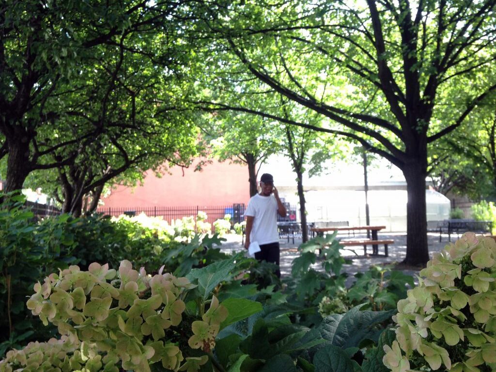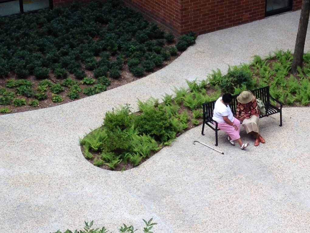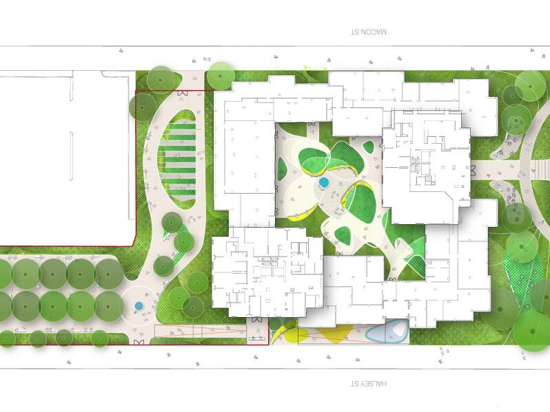 The Saratoga Square landscape serves the residents of its 251 apartments as well as the Community Senior Center located on the ground floor. In the redesign for this public housing site, JPLA had two main strategies: to remove existing physical and visual barriers to access, and to create an open landscape with a variety of spaces within. The design creates a clear hierarchy of accessible entrances, secure boundaries around the site, and an open campus that allows free movement and access to active and quiet spaces. A significant part of the design focuses on the main Saratoga Avenue entrance, where a monumental stair and accessible ramps lead to terraces adjacent to this building entrance. Here, one can sit and gather with neighbors and look out to Saratoga Park across the street. The landscape for the site includes extensive native and adaptive planting, a mix of paving, seating areas, the preservation of a mature bosque of Linden trees, raised community garden beds, and an interior garden courtyard. With new floor-to-ceiling windows and access points on the courtyard, the interior courtyard is a peaceful place to gather for both the residents and members of the Community Senior Center. A simple graphic of organic-shaped planting beds surrounded by paving is a beautiful sight to view from the apartments on floors above.