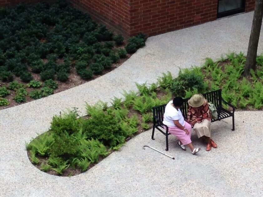 The Saratoga Square landscape serves the residents of its 251 apartments as well as the Community Senior Center located on the ground floor. In the redesign for this public housing site, JPLA had two main strategies: to remove existing physical and visual barriers to access, and to create an open landscape with a variety of spaces within. The design creates a clear hierarchy of accessible entrances, secure boundaries around the site, and an open campus that allows free movement and access to active and quiet spaces. A significant part of the design focuses on the main Saratoga Avenue entrance, where a monumental stair and accessible ramps lead to terraces adjacent to this building entrance. Here, one can sit and gather with neighbors and look out to Saratoga Park across the street. The landscape for the site includes extensive native and adaptive planting, a mix of paving, seating areas, the preservation of a mature bosque of Linden trees, raised community garden beds, and an interior garden courtyard. With new floor-to-ceiling windows and access points on the courtyard, the interior courtyard is a peaceful place to gather for both the residents and members of the Community Senior Center. A simple graphic of organic-shaped planting beds surrounded by paving is a beautiful sight to view from the apartments on floors above.