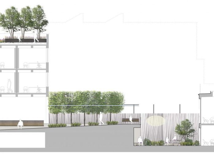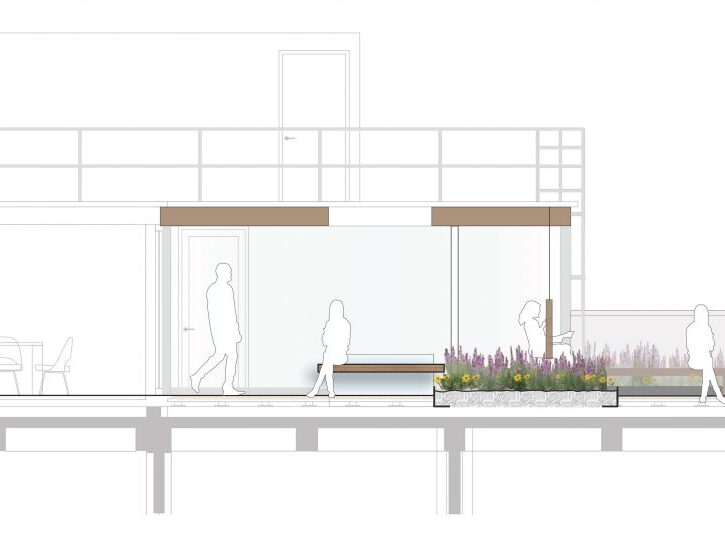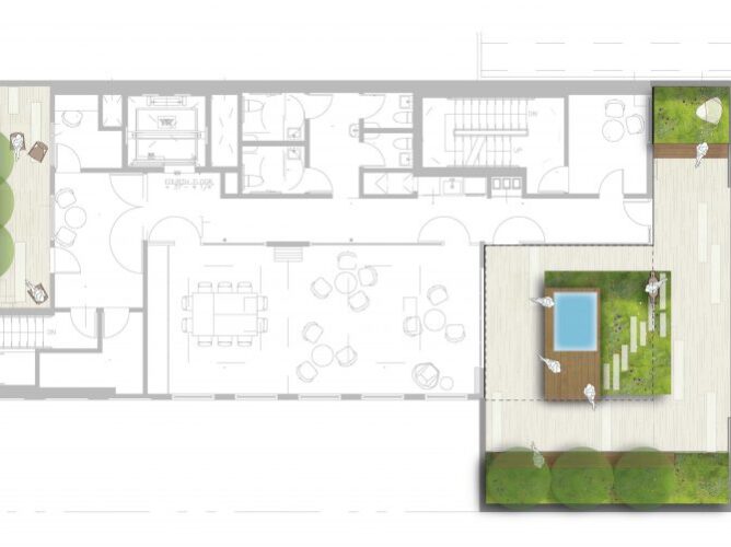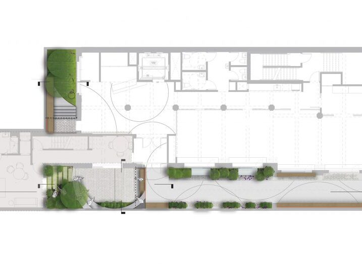 The building renovation incorporates several new landscapes spaces including the facade and streetscape, the entrance corridor, a sunken garden, a viewing garden, and two rooftop terraces. In all of these spaces, connections between the interior and exterior spaces create smooth transitions and connections between building and landscape. There were many opportunities to bring nature into the building – a skylight in the roof terrace that illuminates a custom green wall in the library, interior plantings throughout the rooms, floor to ceiling glass doors and windows that create visual and physical access to the gardens and the extension of paving from outside to inside.
