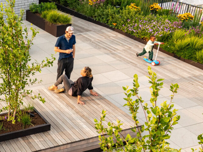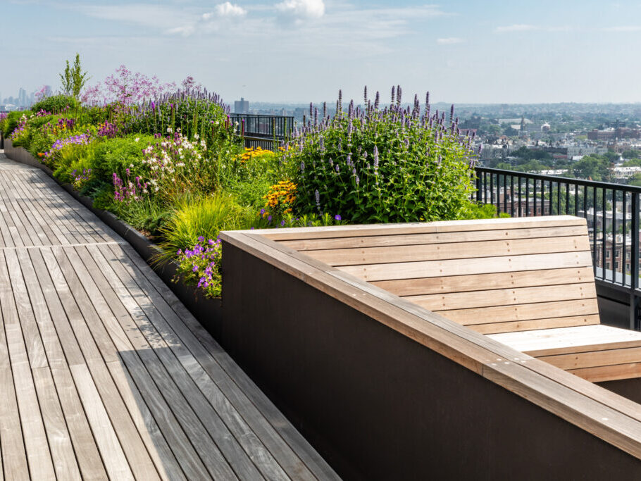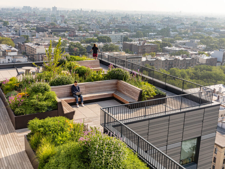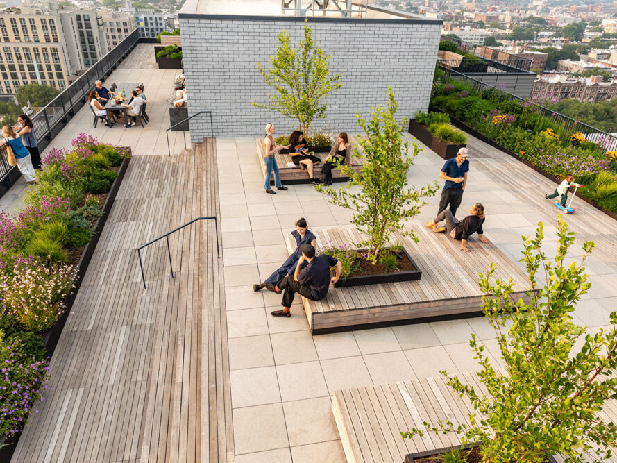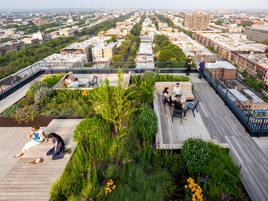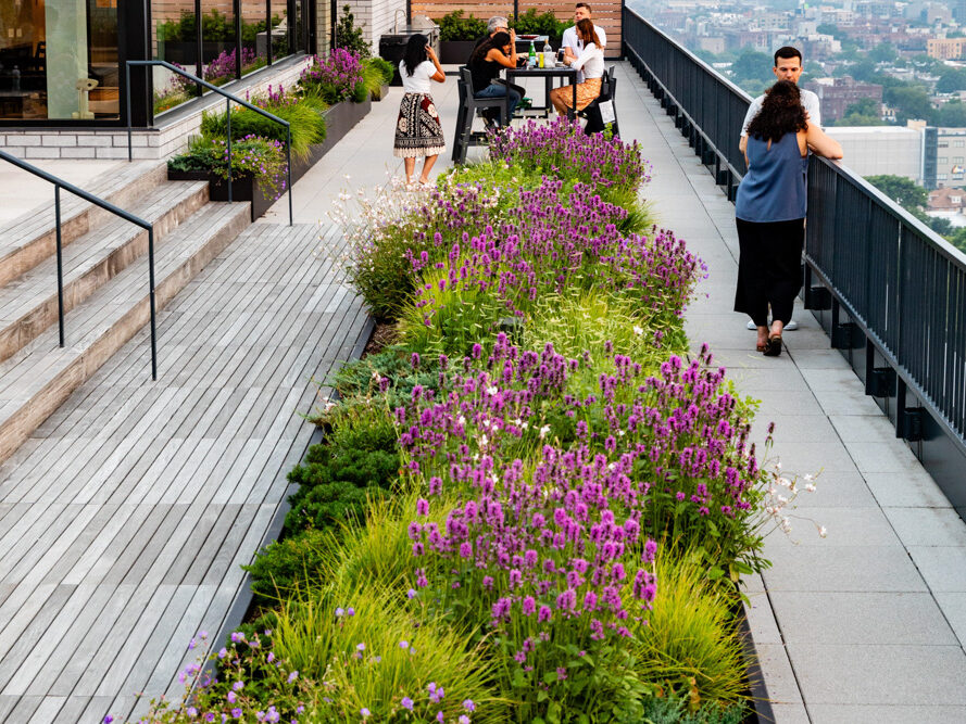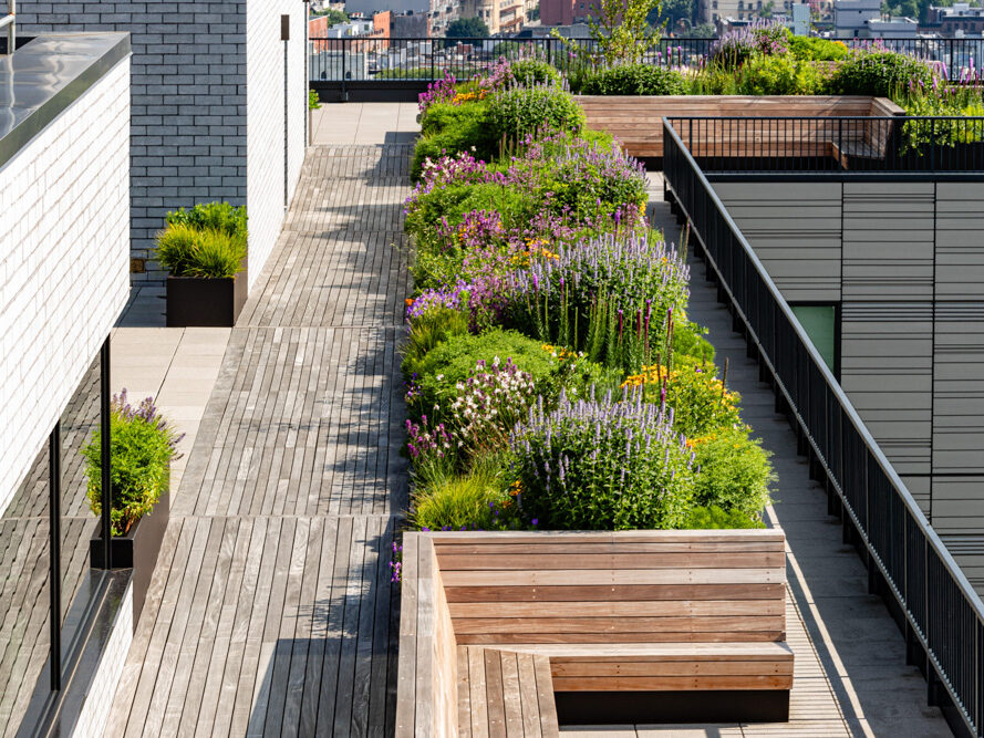 This multi-family residential building in the Crown Heights neighborhood of Brooklyn features a 12,000 sf rooftop terrace on the 16th floor and two 4,000 sf viewing gardens on the ground level. The Arch includes a combination of affordable and market rate residences as part of a larger mixed-use development in the neighborhood that includes the transformation of a historic armory building into a community recreation and wellness center. The rooftop landscape includes custom wood banquettes and benches, a raised viewing deck with lounging platforms, a fitness area, and two outdoor kitchens – all connected by a linear wood boardwalk pathway amongst native meadow plantings. The viewing gardens on the ground floor are pictorial landscapes designed to be viewed from the various perspectives of apartment windows on either side of the building.