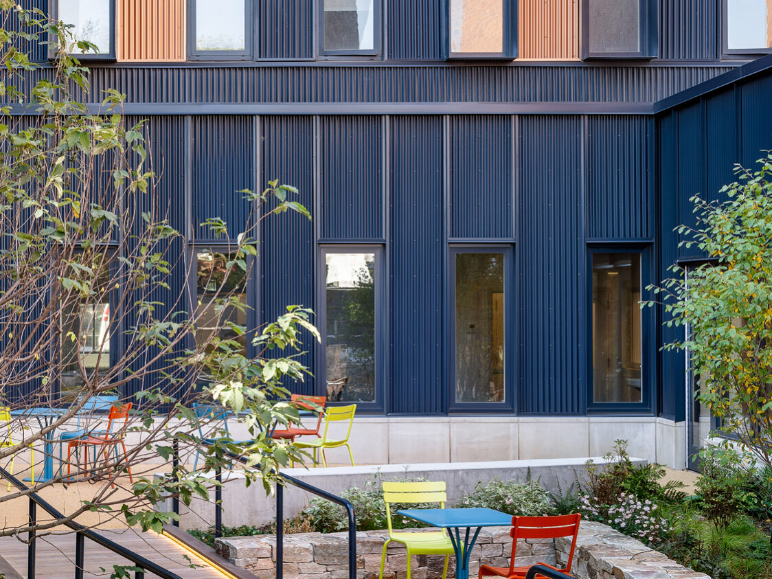Together, the landscape spaces create a campus that bring residents together to observe and interact with each other and the living environment. Our design provides opportunities to participate in the landscape and includes elements such as interactive musical instruments, fitness class spaces with soft safety surfaces, stationary bicycles, and a walking loop to encourage physical activity through out the building and its open spaces. A palette of natural materials, wood decking, stone walls and stabilized aggregate pavement creates a soothing setting. Movable tables and chairs in vibrant colors provide energetic accents.  A natural planting scheme includes native and adaptive species such as sedges, ferns, blueberry, pussy willow and sumac.